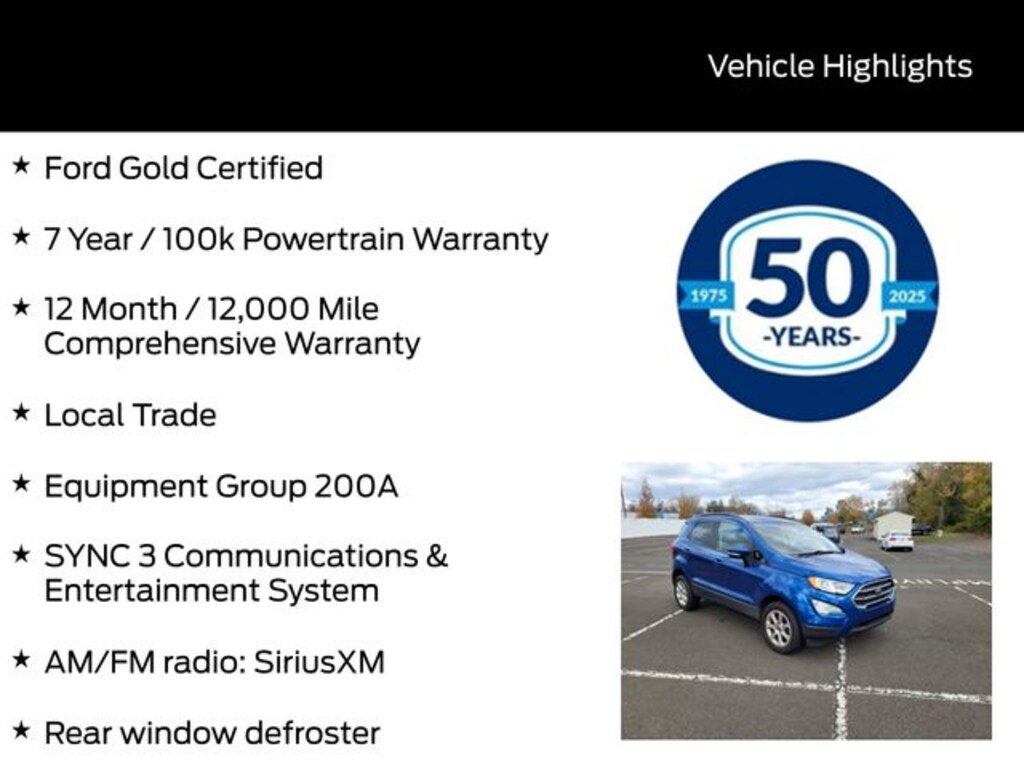 Recent Arrival! 2021 Ford EcoSport SE 2.0L I4 Ti-VCT GDI 6-Speed Automatic 4WD 4D Sport Utility Lightning Blue Ford Gold Certified, 7 Year / 100k Powertrain Warranty, 12 Month / 12,000 Mile Comprehensive Warranty, Local Trade, AM/FM radio: SiriusXM, AppLink/Apple CarPlay and Android Auto, Automatic temperature control, Equipment Group 200A, Front Bucket Seats, Heated front seats, Power door mirrors, Power moonroof, Power windows, Rear window defroster, Rear window wiper, Remote keyless entry, Speed control, SYNC 3 Communications & Entertainment System, Tilt steering wheel, Turn signal indicator mirrors, Unique Cloth Heated Front Bucket Seats, Wheels: 16" Shadow Silver-Painted Aluminum. 23/29 City/Highway MPG