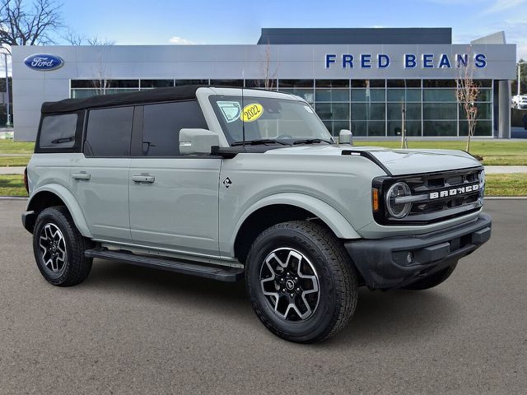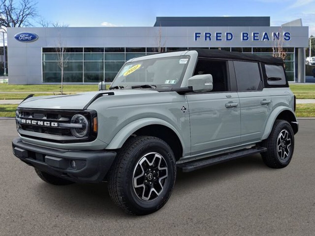 Recent Arrival! 2022 Ford Bronco Outer Banks 2.7L EcoBoost V6 10-Speed Automatic 4D Sport Utility Cactus Gray Bought & Serviced at Fred Beans, Local Trade, Great Service History, Factory Certified Vehicle, 5 Day Return / 30 Day Exchange, Auto Reward Program, Bronco Outer Banks Advanced, 4D Sport Utility, 2.7L EcoBoost V6, 10-Speed Automatic, 4WD, Cactus Gray, Black Onyx Cloth, 12" LCD Capacitive Touchscreen w/Swipe Capability, 2 Smart Charging USB Ports In Dashboard, 360-Degree Camera, Adaptive Cruise Control, Additional Sound Deadening, Connected Built-In Navigation, Equipment Group 314A Lux Package, Evasive Steering Assist, Front Parking Sensors, Heated Steering Wheel, Information on Demand Panel, Radio: B&O Sound System by Bang & Olufsen, Sideview Mirrors, Universal Garage Door Opener, Wireless Charging Pad.