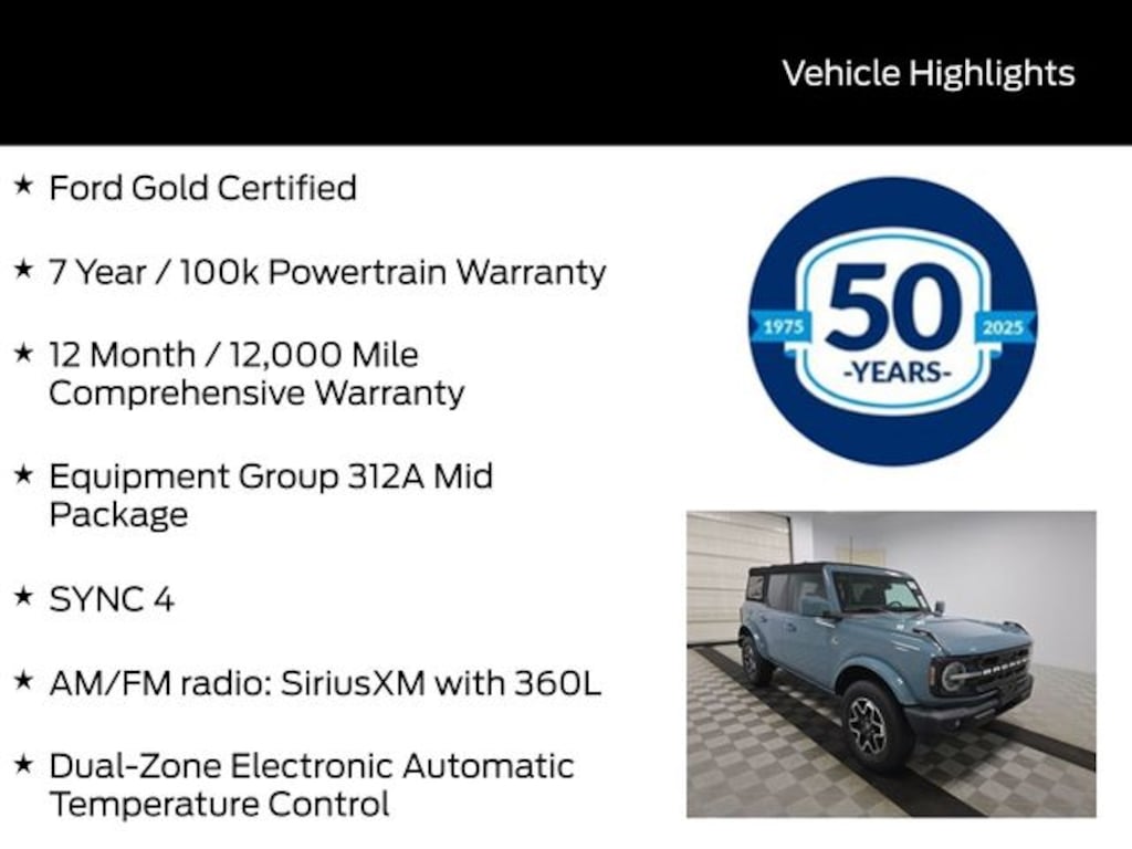 Inside, you'll find a wealth of premium features, including SYNC 4, dual-zone climate control, heated front seats, and an impressive 18-inch bright machined aluminum wheels. The Bronco's spacious and versatile interior offers ample room for passengers and cargo, making it the perfect companion for your active lifestyle.