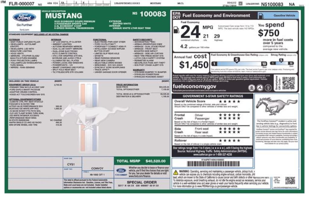 2022 Ford Mustang EcoBoost Premium EcoBoost 2.3L I4 GTDi DOHC Turbocharged VCT 6-Speed Manual RWD 2D Coupe Oxford White 3 Month / 4,000 Mile Comprehensive Warranty, Ford Blue Advantage Certified, 12" LCD Digital Instrument Cluster w/MyColor, Active Valve Performance Exhaust, Adaptive Cruise Control, AM/FM radio: SiriusXM, Automatic temperature control, Clear LED Taillamps w/Sequential Turn Signals, Equipment Group 201A, Exterior Parking Camera Rear, Ford Safe & Smart Package, Front Bucket Seats, Front dual zone A/C, Heated door mirrors, Heated Steering Wheel, Ice White Performance Rear Wing, Leather-Trimmed Bucket Seats w/Color Accents, Memory Driver Seat, Mirrors & Ambient Lighting, Mustang Ice White Appearance Package, Power door mirrors, Rain sensing wipers, Rear Parking Sensors, SYNC 3 Communications & Entertainment System, Unique Black Grille, Unique Leather-Trimmed Front Bucket Seats, Universal Garage Door Opener (UGDO), Voice-Activated Touch-Screen Navigation System, Wheels: 19" x 9" Machined-Face Alum. 21/29 City/Highway MPG