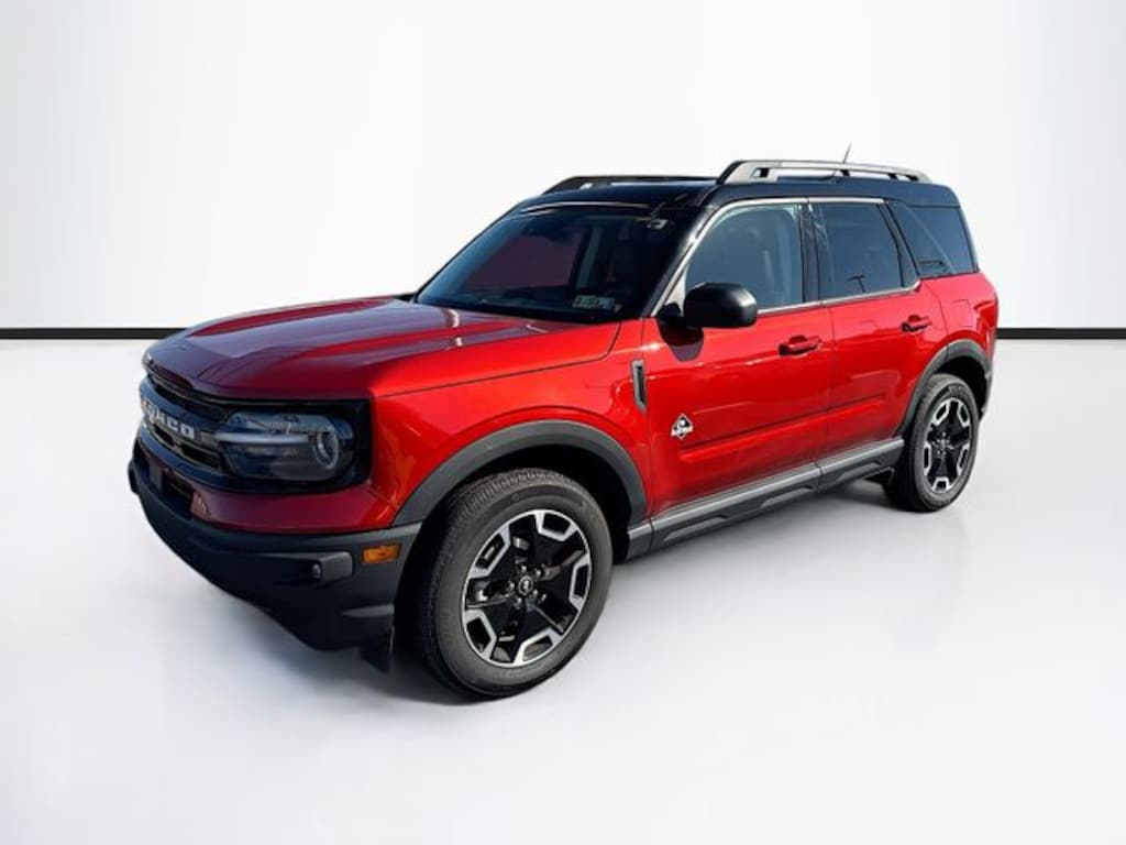 2024 Ford Bronco Sport Outer Banks 1.5L EcoBoost 8-Speed Automatic 4WD 4D Sport Utility Chili Pepper Red Local Trade, 7 Year / 100k Powertrain Warranty, 12 Month / 12,000 Mile Comprehensive Warranty, Free First Oil Change, 5 Day Return / 30 Day Exchange, Auto Reward Program, Ford Certified, Navigation System, 3.80 Axle Ratio, 4-Wheel Disc Brakes, 6 Speakers, ABS brakes, Air Conditioning, Alloy wheels, AM/FM radio: SiriusXM, AM/FM Stereo, Auto High-beam Headlights, Auto-dimming Rear-View mirror, Automatic temperature control, Brake assist, Cargo Management System, Compass, Delay-off headlights, Driver door bin, Driver vanity mirror, Dual front impact airbags, Dual front side impact airbags, Electronic Stability Control, Emergency communication system: SYNC 3 911 Assist, Equipment Group 300A, Evasive Steering Assist, Ford Co-Pilot360 Assist+, Four wheel independent suspension, Front & Rear Floor Liners w/o Carpet Mats, Front anti-roll bar, Front Bucket Seats, Front Center Armrest, Front dual zone A/C, Front fog lights, Front reading lights, Fully automatic headlights, HD Radio, Heated door mirrors, Heated front seats, Heated steering wheel, Illuminated entry, Intelligent Adaptive Cruise Control w/Stop & Go, Knee airbag, Low tire pressure warning, Memory seat, Occupant sensing airbag, Outside temperature display, Overhead airbag, Overhead console, Panic alarm, Passenger door bin, Passenger vanity mirror, Power door mirrors, Power driver seat, Power Moonroof, Power passenger seat, Power steering, Power windows, Premium-Trimmed Heated Sport Contour Bucket Seats, Radio data system, Rain sensing wipers, Rear anti-roll bar, Rear Parking Sensors, Rear reading lights, Rear seat center armrest, Rear window defroster, Rear window wiper, Remote keyless entry, Security system, SiriusXM, Speed control, Speed-sensing steering, Speed-Sensitive Wipers, Split folding rear seat, Steering wheel mounted audio controls, SYNC 3 Communications & Entertainment System, Tachometer, Tech Package, Telescoping steering wheel, Tilt steering wheel, Traction control, Trip computer, Universal Garage Door Opener (UGDO), Variably intermittent wipers, Voice-Activated Touchscreen Navigation System, Wheels: 18" Ebony Black-Painted Aluminum, Wireless Charging Pad, FORD GOLD CERTIFIED PRE-OWNED, Navigation System.