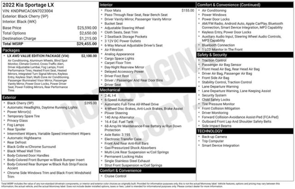 Recent Arrival! 2022 Kia Sportage LX 2.4L I4 DGI DOHC 16V 6-Speed Automatic Electronic with Overdrive AWD 4D Sport Utility Black Cherry Pearl AWD, 10-Way Power Adjustable Driver Seat, 17" Alloy Wheels, 4-Wheel Disc Brakes, 6 Speakers, 6-Way Manual Adjustable Driver's Seat, ABS brakes, Air Conditioning, Alloy wheels, AM/FM radio, Apple CarPlay & Android Auto, Auto High-beam Headlights, Axle Ratio: 3.195, Blind Spot Collision Warning, Brake assist, Bumpers: body-color, Carpeted Floor Mats, Cloth Seat Trim, Delay-off headlights, Driver door bin, Driver vanity mirror, Dual front impact airbags, Dual front side impact airbags, Dual Zone Automatic Climate Control, Electronic Stability Control, Exterior Parking Camera Rear, Fog Lights w/Gloss Black Trim, Four wheel independent suspension, Front anti-roll bar, Front Bucket Seats, Front Center Armrest, Front fog lights, Front reading lights, Fully automatic headlights, Heated Front Seats, Heated Outside Mirrors, Illuminated entry, Illuminated Sunvisor Mirror, Low tire pressure warning, LX AWD Value Edition Package, Occupant sensing airbag, Outside temperature display, Overhead airbag, Overhead console, Panic alarm, Passenger door bin, Passenger vanity mirror, Power door mirrors, Power Folding Outside Mirrors w/LED Turn Signals, Power steering, Power windows, Radio: AM/FM Audio System, Rear anti-roll bar, Rear Cross-Traffic Collision Warning, Rear seat center armrest, Rear window defroster, Rear window wiper, Remote keyless entry, Security system, Smart Key w/Push Button Start, Smart Welcome, Solar Glass, Speed control, Speed-sensing steering, Split folding rear seat, Spoiler, Steering wheel mounted audio controls, Tachometer, Telescoping steering wheel, Tilt steering wheel, Traction control, Trip computer, Unique Front Fascia w/28 Degree Approach Angle, Variably intermittent wipers, Wheels: 18" Dark Gray Alloy, Windshield Wiper De-Icer, YES Essentials Stain Resistant Seat Trim, AWD.