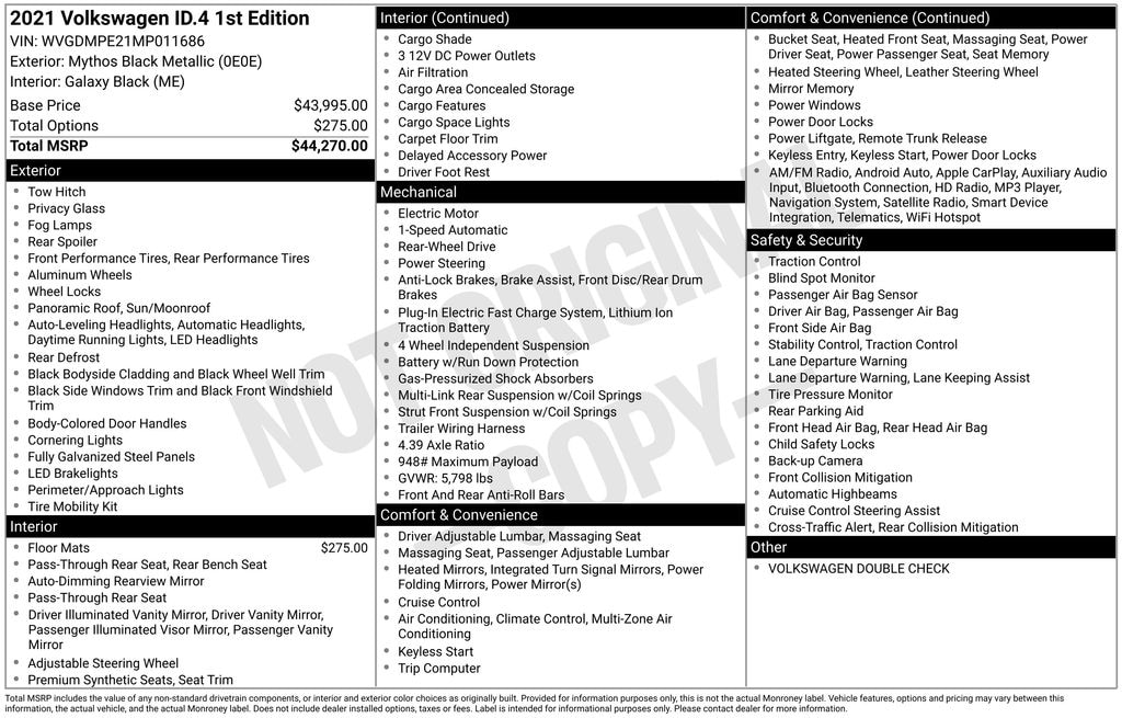 I have been driving since 1969 and have owned 17 new vehicles since. A number of them premium vehicles. This is the first vehicle I've ever owned that I've found to be 100% pure joy. The seats are premium to the core. Comfortable beyond anything I've sat in including a top Volvo I owned which I thought had the best seats ever. The overall ergonomic design is near genius and unlike the Tesla I sat in made so much more sense. The ride quality is near sumptuous as it soaks up road defects very nicely indeed but still handles unlike ANY SUV is capable of without leaning into turns, so it's a real fun driving experience. I felt the Infotainment system to be a joy as well. The sound is a definite step beyond the previous 2020 Tiguan SEL I owned. All the features accessible from the screen is very extensive to say the least and easy to navigate. The AC and even the heat are surprisingly effective delivering either cold or heat on demand, NO waiting. The lights are something else altogether. I have the Pro S and the front lights follow where you are steering for best view. Also some light is spread out to the sides of the vehicle for even a better idea what you are driving into and near. The poor weather light option in the menu (which takes the place of a fog light) is another world of view. Cuts right through ground fog and yet provides even more actual light to the road as well. The storage space is tremendous and there is NO such need for a so called "frunk" which frankly will compromise the front end collision safety. VW also carefully designed it's front end in this manner to allow for superior safety both for the passengers as well as a person that might be hit by it. At 85mph it is near whisper quiet where you can easily hold a conversation or near your music or news on the radio without that annoying engine buzz. Electric has changed my life for the better. My average costs for a so called full charge from 20% to 90% is just over $4.00, a far cry from an equivalent charge for the gas of over $70.00. All I can say is one test drive will convince the majority of folks that this is THE alternative to all other types of vehicles. I test drove a Mach E Ford and along with a Tesla felt the ride quality was definitely better with the VW. There are a lot more dealers to deal with for VW as well which was also a factor.… - 5.0
