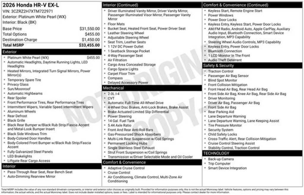 White 2026 Honda HR-V EX-L AWD CVT 2.0L I4 DOHC 16V i-VTEC