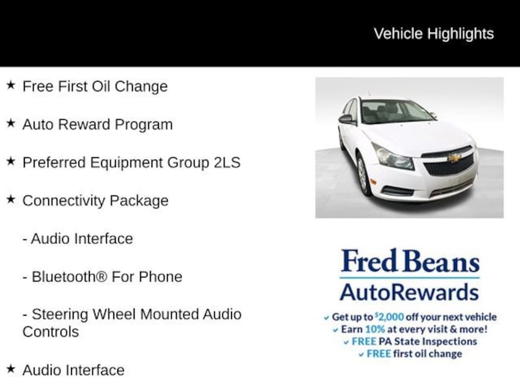 Clean CARFAX.2012 Chevrolet Cruze LS ECOTEC 1.8L I4 DOHC VVT 6-Speed Automatic Electronic with Overdrive FWD 4D Sedan Summit White Free First Oil Change, Auto Reward Program, Audio Interface, Bluetooth® For Phone, Connectivity Package, Preferred Equipment Group 2LS, Steering Wheel Mounted Audio Controls.Odometer is 2482 miles below market average!For better peace of mind all our used vehicles have a 127-point inspection and come with a 5-day return, 30-day exchange (As-Is vehicles are excluded). Our exclusive Auto Rewards Program provides better value with Free First Oil change, Free Pa State Safety inspections, discounts for local merchants and more. Plus, you can earn up to $2000 towards your next vehicle just by servicing with Fred Beans! As Fred Beans always says, our used cars are better because our reputation depends on it.Awards:* 2012 IIHS Top Safety Pick * 2012 KBB.com 10 Most Comfortable Cars Under $30,000Reviews:* * Excellent fuel economy * Cruze ECO model gets 42 mpg on the highway * Turbo model now available with 6-speed manual transmission * Quiet cabin Source: KBB.com* Upscale interior design; lively yet efficient turbocharged engine; Eco model's high fuel economy; secure handling; top safety scores; big trunk. Source: EdmundsAlthough every reasonable effort has been made to ensure the accuracy of the information contained on this site, absolute accuracy cannot be guaranteed. This site, and all information and materials appearing on it, are presented to the user as is without warranty of any kind, either express or implied. All vehicles are subject to prior sale. Price does not include applicable tax, title, license, processing and/or documentation fees. Vehicles shown at different locations are not currently in our inventory (Not in Stock) but can be made available to you at our location within a reasonable date from the time of your request, not to exceed one week. Residency restrictions may apply.