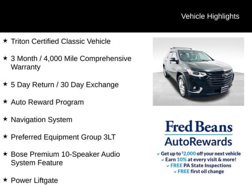 This Traverse is Triton Certified, meaning it has undergone a rigorous inspection and reconditioning process to ensure it meets the highest standards of quality and reliability. With a comprehensive 3-month/4,000-mile warranty and a 5-day return/30-day exchange policy, you can purchase with confidence, knowing that your investment is protected.