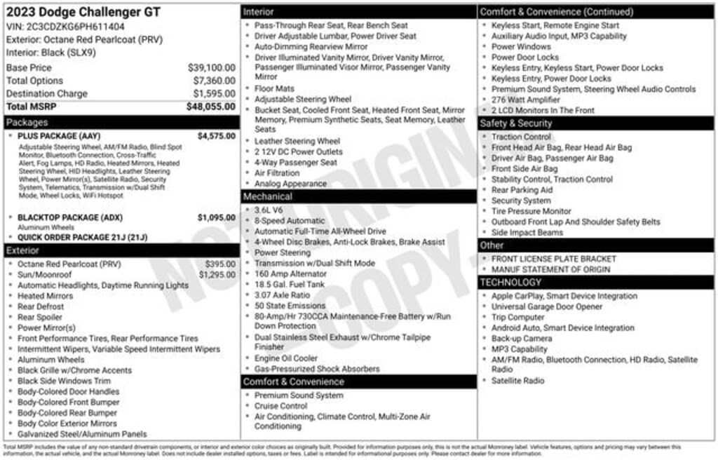 Recent Arrival! 2023 Dodge Challenger GT 3.6L V6 24V VVT 8-Speed Automatic AWD 2D Coupe Octane Red Pearlcoat Local Trade, 1-Yr SiriusXM Guardian Trial, 276 Watt Amplifier, 4G LTE Wi-Fi Hot Spot, 8.4" Touchscreen Display, Apple CarPlay, Automatic temperature control, AWD Rhombi Black Badge, Black Fuel Filler Door, Black Grille w/Bezel, Blacktop Package, Blind Spot & Cross Path Detection, Body Color Exterior Mirrors, Bright Pedals, Challenger Blacktop Grille Badge, Compass Gauge, Deluxe Security Alarm, Dodge Performance Pages, Door Trim Panel w/Ambient Lighting, Exterior Mirrors w/Heating Element, For Details, Visit DriveUconnect.com, Front Bucket Seats, Front dual zone A/C, Front Fog Lamps, Gloss Black I/P Cluster Trim Rings, Google Android Auto, GPS Antenna Input, GT Black Grille Badge, HD Radio, Heated Steering Wheel, High-Intensity Discharge Headlamps, Integrated Center Stack Radio, Integrated Voice Command w/Bluetooth, Leather Performance Steering Wheel, Media Hub (2 USB, AUX), Nappa/Alcantara Performance Seats, ParkView Rear Back-Up Camera, Plus Package, Power Multi-Function Foldaway Mirrors, Power Sunroof, Power Tilt/Telescope Steering Column, Power windows, Premium-Stitched Dash Panel, Quick Order Package 21J, Radio: Uconnect 4C w/8.4" Display, Rear window defroster, Remote keyless entry, Rhombi 2-Pc Wheel Center Cap, Satin Black Dodge Tail Lamp Badge, Shark Fin Antenna, SiriusXM Satellite Radio, Speed control, Steering Wheel Mounted Shift Control, USB Host Flip, Ventilated Front Seats, Wheels: 20" x 8" Black Noise AWD. 18/27 City/Highway MPG