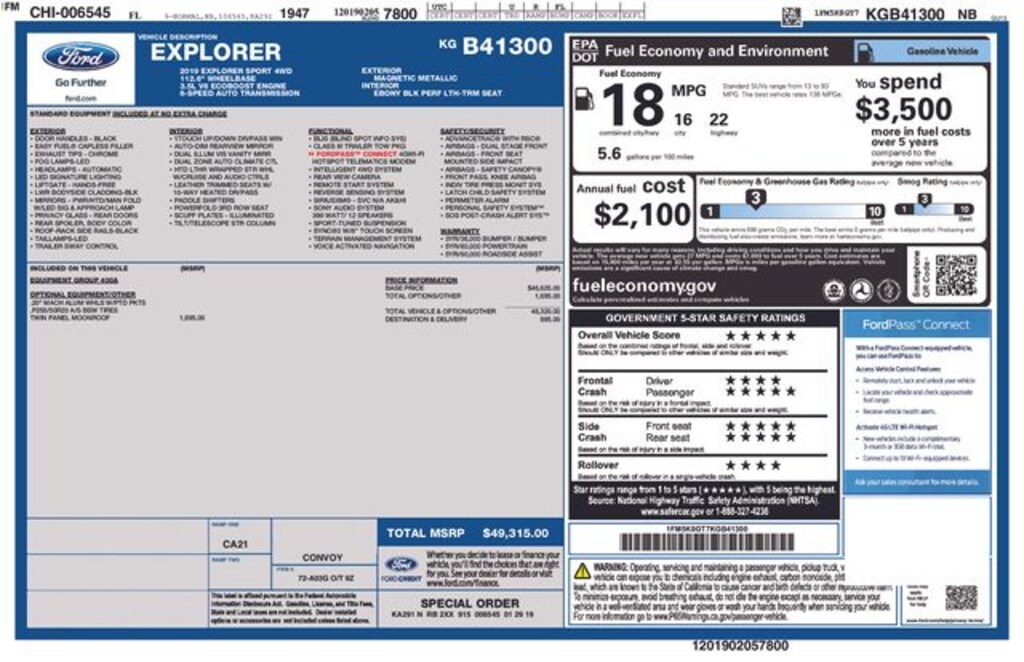 2019 Ford Explorer Sport 3.5L V6 6-Speed Automatic with Select-Shift 4WD 4D Sport Utility Magnetic Local Trade, 3 Month / 4,000 Mile Comprehensive Warranty, Ford Blue Advantage Certified, 12 Speakers, 20" Machined Aluminum w/Painted Pockets Wheels, AM/FM radio: SiriusXM, AppLink/Apple CarPlay and Android Auto, Automatic temperature control, Equipment Group 400A, Exterior Parking Camera Rear, Front dual zone A/C, Front fog lights, Heated door mirrors, Heated steering wheel, Perforated Leather Heated Bucket Seats, Power door mirrors, Power driver seat, Power Liftgate, Power passenger seat, Power windows, Premium audio system: Sony, Rear air conditioning, Rear window defroster, Rear window wiper, Remote keyless entry, Speed control, SYNC 3 Communications & Entertainment System, Turn signal indicator mirrors, Twin Panel Moonroof.