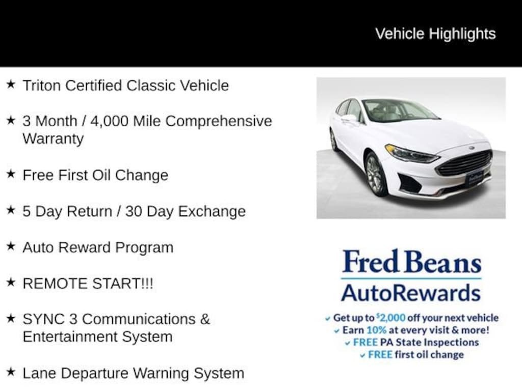 Clean CARFAX.Recent Arrival! 2019 Ford Fusion SEL 1.5L EcoBoost 6-Speed Automatic FWD 4D Sedan Oxford White Triton Certified Classic Vehicle, 3 Month / 4,000 Mile Comprehensive Warranty, Free First Oil Change, 5 Day Return / 30 Day Exchange, Auto Reward Program, REMOTE START!!!, 6-Speed Automatic, Lane Departure Warning System, SYNC 3 Communications & Entertainment System, Wheels: 18 Premium-Painted Aluminum.Odometer is 54736 miles below market average!Certified. Certification Program Details: Triton Certified Shield Classic 3-Month or 4,000-Mile Comprehensive Coverage ($100 deductible) 100+ Multipoint Inspection PA State Inspection & Emissions Test Oil, Lube, & Filter Service Completed 5-Day Return Policy1 30-Day Exchange Policy2 CARFAXTM Report AutoRewards Membership See salesperson for additional offers & complete details.For better peace of mind all our used vehicles have a 127-point inspection and come with a 5-day return, 30-day exchange (As-Is vehicles are excluded). Our exclusive Auto Rewards Program provides better value with Free First Oil change, Free Pa State Safety inspections, discounts for local merchants and more. Plus, you can earn up to $2000 towards your next vehicle just by servicing with Fred Beans! As Fred Beans always says, our used cars are better because our reputation depends on it.Awards:* JD Power Initial Quality Study (IQS)Although every reasonable effort has been made to ensure the accuracy of the information contained on this site, absolute accuracy cannot be guaranteed. This site, and all information and materials appearing on it, are presented to the user as is without warranty of any kind, either express or implied. All vehicles are subject to prior sale. Price does not include applicable tax, title, license, processing and/or documentation fees. Vehicles shown at different locations are not currently in our inventory (Not in Stock) but can be made available to you at our location within a reasonable date from the time of your request, not to exceed one week. Residency restrictions may apply.