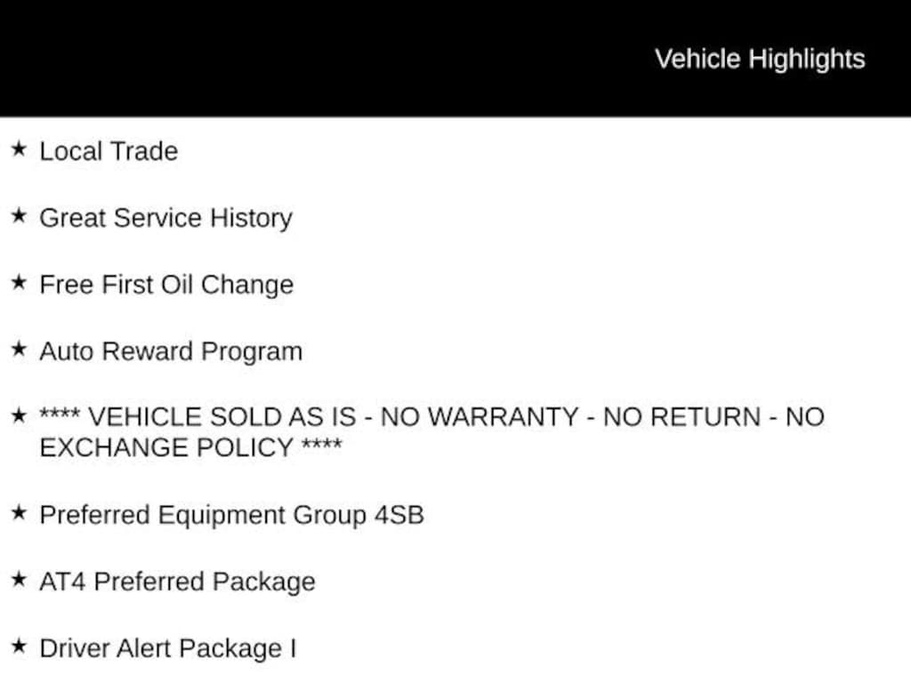 2020 GMC Sierra 1500 AT4 EcoTec3 5.3L V8 10-Speed Automatic 4D Crew Cab Pacific Blue Metallic Local Trade, Great Service History, Free First Oil Change, Auto Reward Program, **** VEHICLE SOLD AS IS - NO WARRANTY - NO RETURN - NO EXCHANGE POLICY ****, Sierra 1500 AT4, 4D Crew Cab, EcoTec3 5.3L V8, 10-Speed Automatic, 4WD, Pacific Blue Metallic, Jet Black With Kalahari Accents Leather, 12-Volt Rear Auxiliary Power Outlet, 120-Volt Instrument Panel Power Outlet, 170 Amp Alternator, 2 USB Ports, 2 USB Ports (1st Row), 4.2" Diagonal Color Display Driver Info Center, 4G LTE Wi-Fi Hotspot Capable, All-Weather Floor Liners w/AT4 Logo (LPO), AT4 Preferred Package, Auxiliary External Transmission Oil Cooler, Body-Color Surround Grille, Color-Keyed Carpeting Floor Covering, Compass, Deep-Tinted Glass, Driver Alert Package I, Electric Rear-Window Defogger, Electrical Lock Control Steering Column, Floor-Mounted Center Console, GMC Connected Access Capable, HD Radio, HD Rear Vision Camera, Heated 2nd Row Outboard Seats, Heated Driver & Front Outboard Passenger Seating, Heavy-Duty Rear Locking Differential, High-Capacity Air Filter, Hill Descent Control, Hitch Guidance, Integrated Trailer Brake Controller, Keyless Open & Start, Lane Change Alert w/Side Blind Zone Alert, LED Cargo Area Lighting, Manual Tilt-Wheel & Telescoping Steering Column, OnStar & GMC Connected Services Capable, Perimeter Lighting, Power Door Locks, Power Front Passenger Windows w/Express Up/Down, Power Front Windows w/Driver Express Up/Down, Power Rear Windows w/Express Down, Power Sliding Rear Window w/Rear Defogger, Preferred Equipment Group 4SB, Premium Bose 7-Speaker Sound System, ProGrade Trailering System, Radio: Premium GMC Infotainment Sys w/Navigation, Rear Cross Traffic Alert, Rear Dual USB Charging-Only Ports, Rear Wheelhouse Liners, Red Recovery Hooks, Remote Vehicle Starter System, Spray-On Pickup Bed Liner w/AT4 Logo, Steering Wheel Audio Controls, Theft Deterrent System (Unauthorized Entry), Trailering Package, Ultrasonic Front & Rear Park Assist, Universal Home Remote, Ventilated Driver & Front Passenger Seats, Wireless Charging.