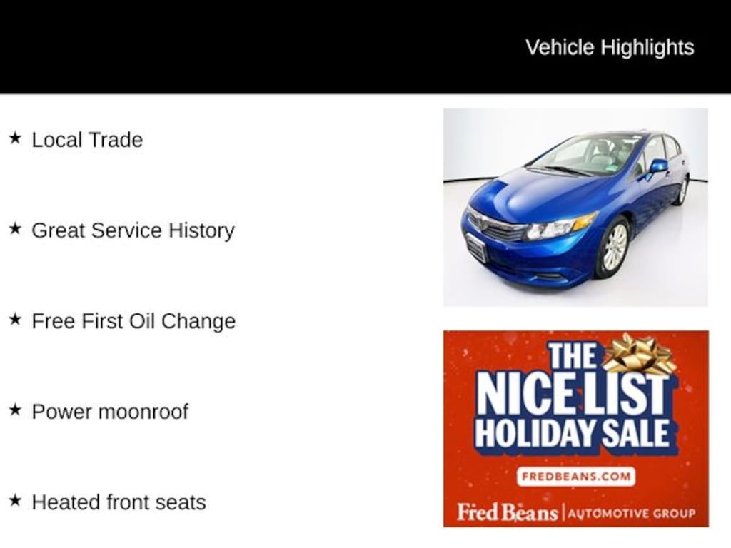 2012 Honda Civic EX-L 1.8L I4 SOHC 16V i-VTEC 5-Speed Automatic FWD 4D Sedan Blue Local Trade, Great Service History, Free First Oil Change, Gray w/Leather Seat Trim, Heated front seats, Power moonroof.