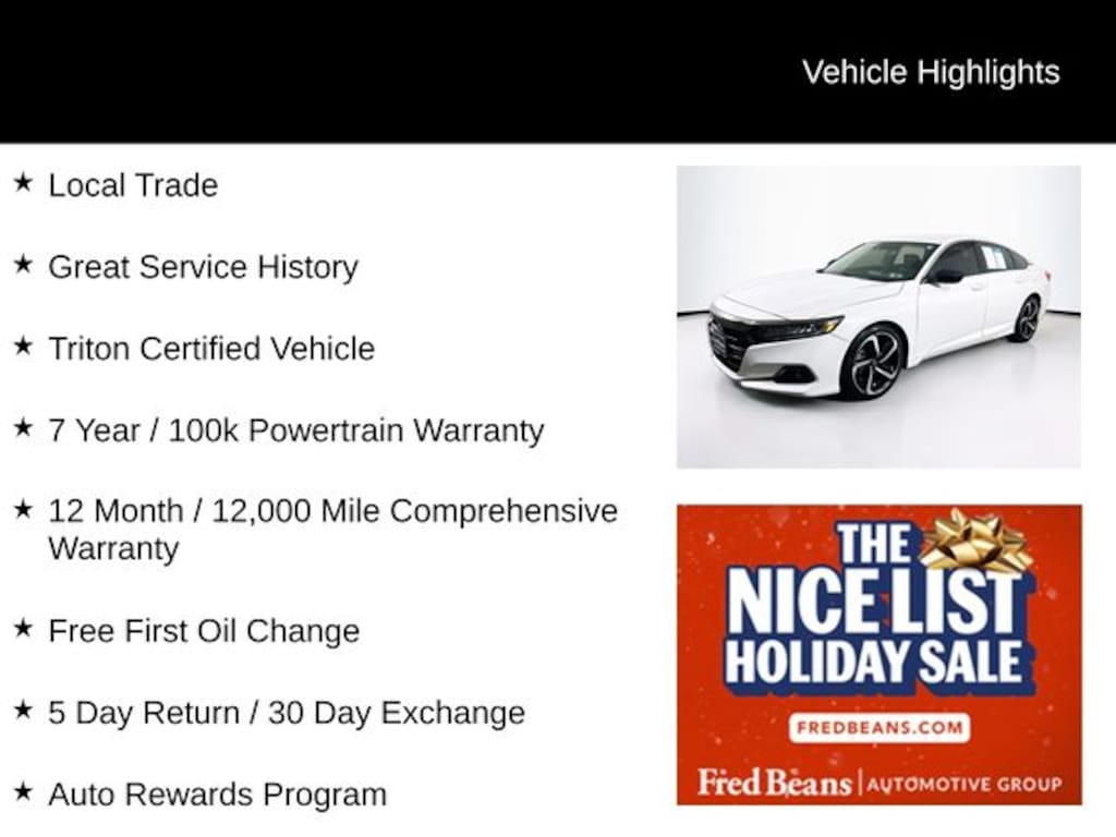 2021 Honda Accord Sport Special Edition Sport Special Edition 1.5T I4 DOHC 16V Turbocharged VTEC CVT FWD 4D Sedan White Local Trade, Great Service History, Triton Certified Vehicle, 7 Year / 100k Powertrain Warranty, 12 Month / 12,000 Mile Comprehensive Warranty, Free First Oil Change, 5 Day Return / 30 Day Exchange, Auto Rewards Program, Black Leather, Adaptive Cruise Control: Adaptive Cruise Control (ACC) with Low-Speed Follow, Apple CarPlay/Android Auto, Automatic temperature control, Brake assist, Electronic Stability Control, Forward collision: Collision Mitigation Braking System (CMBS) + FCW mitigation, Front dual zone A/C, Front fog lights, Fully automatic headlights, Heated door mirrors, Heated Front Bucket Seats, Lane Departure Warning System, Leather-Trimmed Seats, Power driver seat, Power passenger seat, Radio: 180-Watt AM/FM Audio System, Remote keyless entry, Security system, Split folding rear seat, Spoiler, Steering wheel mounted audio controls, Wheels: 19" Machine-Finished Alloy w/Black Inserts.