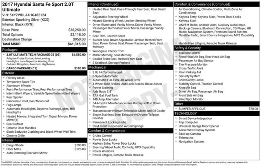 2017 Hyundai Santa Fe Sport 2.0T Ultimate 2.0L I4 DGI DOHC 16V Turbocharged 6-Speed Automatic with Shiftronic AWD 4D Sport Utility Sparkling Silver Local Trade, 3 Month / 4,000 Mile Comprehensive Warranty, Ford Blue Advantage Certified, 2.0T Ultimate Tech Package 05, AM/FM radio: SiriusXM, Android Auto, Auto-Leveling Headlights, Automatic Emergency Braking, Automatic temperature control, Cargo Package, Dynamic Bending Light, Electronic Parking Brake, Exterior Parking Camera Rear, Front Bucket Seats, Front dual zone A/C, Fully automatic headlights, Garage door transmitter: HomeLink, Heated & Ventilated Multi-Adjustable Bucket Seats, Heated door mirrors, Heated rear seats, Heated steering wheel, High Beam Assist, High-Intensity Discharge Headlights, Lane Departure Warning System, Leather Seating Surface, Memory seat, Navigation System, Option Group 05, Power door mirrors, Power driver seat, Power Liftgate, Power moonroof, Power passenger seat, Power windows, Rear Parking Sensors, Rear window defroster, Rear window wiper, Remote keyless entry, Smart Cruise Control, Tilt steering wheel, Turn signal indicator mirrors, Wheels: 19" x 7.5" Alloy.