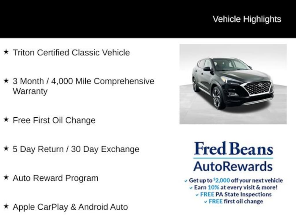 Clean CARFAX. CARFAX One-Owner.2019 Hyundai Tucson Sport 2.4L I4 DGI DOHC 16V 6-Speed Automatic with Shiftronic AWD 4D Sport Utility Black Noir Pearl Triton Certified Classic Vehicle, 3 Month / 4,000 Mile Comprehensive Warranty, Free First Oil Change, 5 Day Return / 30 Day Exchange, Auto Reward Program, AWD, Apple CarPlay & Android Auto.Certified. Certification Program Details: Triton Certified Shield Classic 3-Month or 4,000-Mile Comprehensive Coverage ($100 deductible) 100+ Multipoint Inspection PA State Inspection & Emissions Test Oil, Lube, & Filter Service Completed 5-Day Return Policy1 30-Day Exchange Policy2 CARFAXTM Report AutoRewards Membership See salesperson for additional offers & complete details.For better peace of mind all our used vehicles have a 127-point inspection and come with a 5-day return, 30-day exchange (As-Is vehicles are excluded). Our exclusive Auto Rewards Program provides better value with Free First Oil change, Free Pa State Safety inspections, discounts for local merchants and more. Plus, you can earn up to $2000 towards your next vehicle just by servicing with Fred Beans! As Fred Beans always says, our used cars are better because our reputation depends on it.Although every reasonable effort has been made to ensure the accuracy of the information contained on this site, absolute accuracy cannot be guaranteed. This site, and all information and materials appearing on it, are presented to the user as is without warranty of any kind, either express or implied. All vehicles are subject to prior sale. Price does not include applicable tax, title, license, processing and/or documentation fees. Vehicles shown at different locations are not currently in our inventory (Not in Stock) but can be made available to you at our location within a reasonable date from the time of your request, not to exceed one week. Residency restrictions may apply.