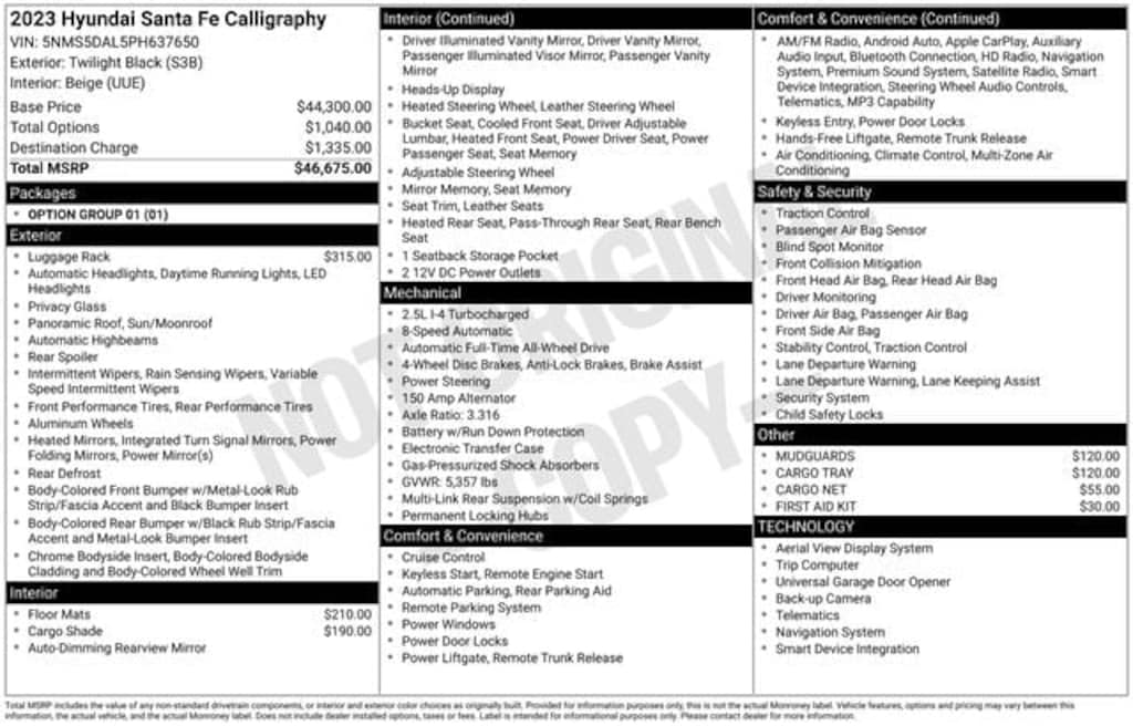 2023 Hyundai Santa Fe Calligraphy 2.5L I4 Shiftronic AWD 4D Sport Utility Twilight Black Local Trade, 3 Month / 4,000 Mile Comprehensive Warranty, Ford Blue Advantage Certified, AM/FM radio: SiriusXM, Apple CarPlay & Android Auto, Automatic temperature control, Exterior Parking Camera Rear, Front Center Armrest, Front dual zone A/C, Garage door transmitter: HomeLink, harman/kardon® Speakers, Heads-Up Display, Heated & Ventilated Front Bucket Seats, Heated door mirrors, Heated rear seats, Heated steering wheel, Memory seat, Navigation System, Option Group 01, Power door mirrors, Power driver seat, Power Liftgate, Power moonroof, Power passenger seat, Power windows, Quilted Premium Nappa Leather Seat Trim, Radio: AM/FM Harman Kardon Display Audio, Rear window defroster, Rear window wiper, Remote keyless entry, Speed control, Tilt steering wheel, Turn signal indicator mirrors, Wheels: 20" x 8.0J Alloy. 21/28 City/Highway MPG