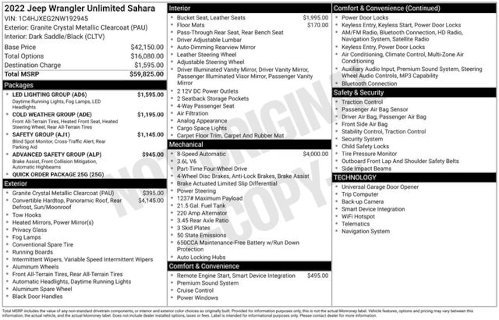 Under the hood, the Wrangler Unlimited Sahara is powered by a robust 3.6L V6 24V VVT engine mated to an 8-Speed Automatic transmission, delivering exceptional on-road and off-road performance with its 4WD capabilities. With an EPA-estimated 19 MPG city and 24 MPG highway, this Jeep balances power and efficiency to meet your driving needs.