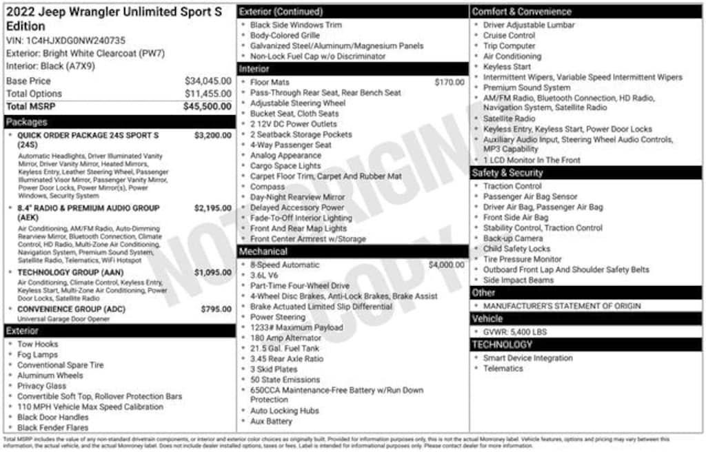 2022 Jeep Wrangler Unlimited Sport S 3.6L V6 24V VVT 8-Speed Automatic 4WD 4D Sport Utility Bright White Clearcoat 3 Month / 4,000 Mile Comprehensive Warranty, Ford Blue Advantage Certified, 1-Year SiriusXM Guardian Trial, 2-Door Passive Entry, Front Door Locks, 4G LTE Wi-Fi Hot Spot, 5-Year SiriusXM Traffic Service, 5-Year SiriusXM Travel Link Service, 8.4" Radio & Premium Audio Group, 8.4" Touchscreen Display, Air Conditioning w/Auto Temperature Control, Air Filtering, Alpine Premium Audio System, Apple CarPlay/Android Auto, Auto-Dimming Rear-View Mirror, Automatic Headlamps, Cloth Low-Back Bucket Seats, Cluster 7.0" TFT Color Display, Convenience Group, Deep Tint Sunscreen Windows, Emergency/Assistance Call, Front 1-Touch Down Power Windows, GPS Navigation, HD Radio, Leather Wrapped Steering Wheel, Off-Road Info Pages, ParkView Rear Back-Up Camera, Power Heated Mirrors, Quick Order Package 24S Sport S, Radio: Uconnect 4C Nav w/8.4" Display, Remote Keyless Entry, Security Alarm, SiriusXM Satellite Radio, SiriusXM Traffic Plus, SiriusXM Travel Link, Speed control, Speed Sensitive Power Locks, Sport S, Sun Visors w/Illuminated Vanity Mirrors, Technology Group, Universal Garage Door Opener, Wheels: 17" x 7.5" Tech Silver Aluminum.
