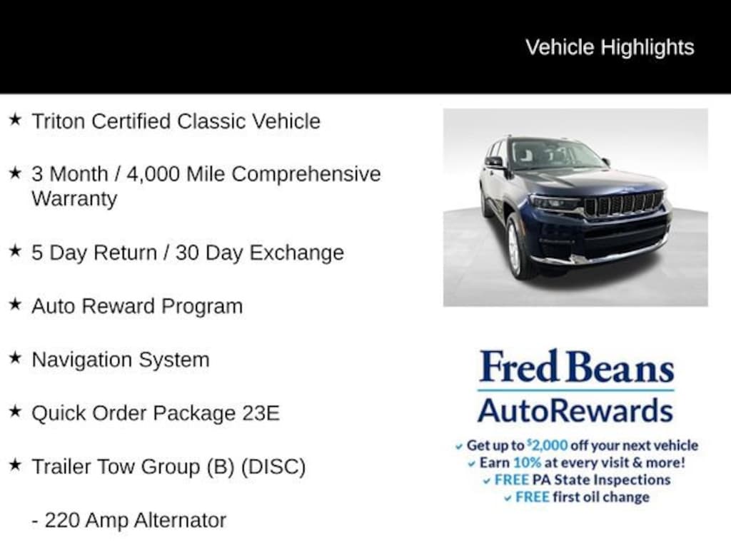 This Jeep Grand Cherokee L Limited is a Triton Certified Classic Vehicle, ensuring you can drive with confidence. Backed by a comprehensive 3-month/4,000-mile warranty and a 5-day return/30-day exchange policy, you can trust that this vehicle has been meticulously inspected and is ready to provide you with years of reliable service.