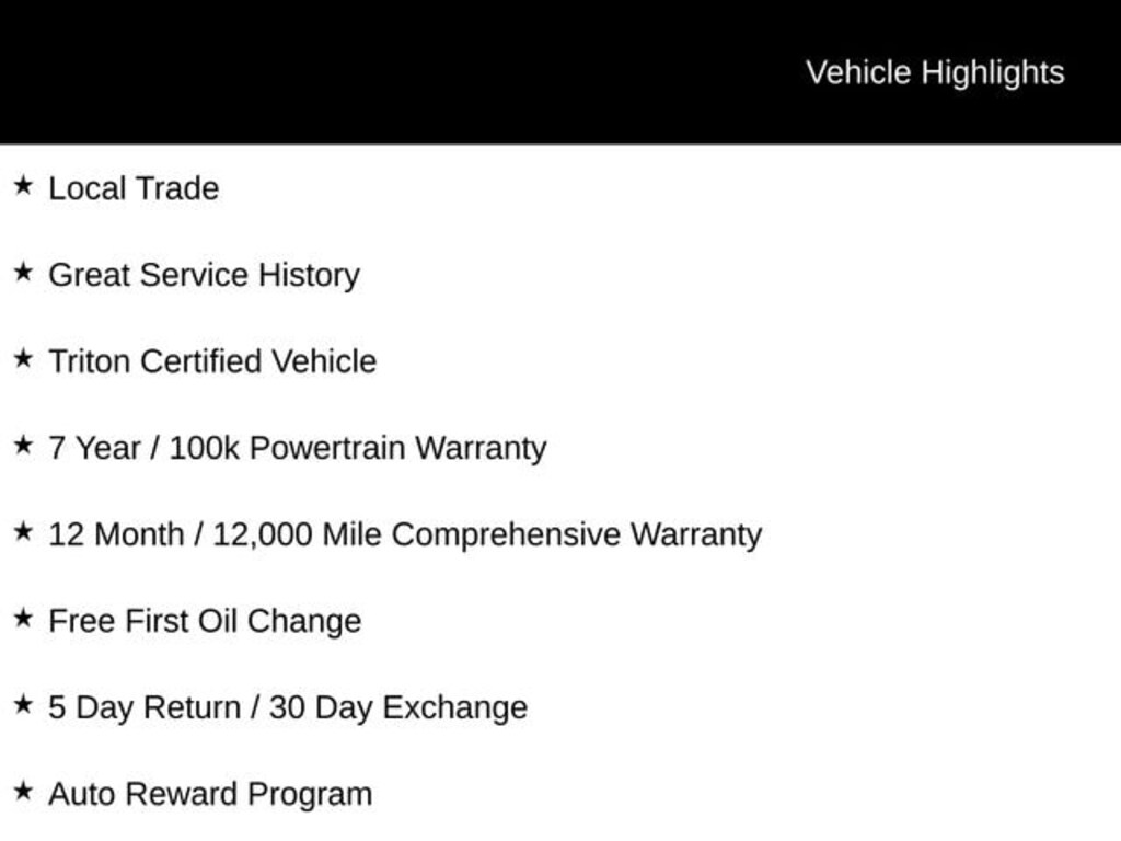 Certified. Certification Program Details: Triton Certified Shield â?¢ 7-Year or up to 100,000-Mile Powertrain Limited Warranty â?¢ 12-Month or 12,000-Mile Comprehensive Coverage ($100 deductible) â?¢ 100+ Multipoint Inspection â?¢ All Fluids Checked â?¢ Tires 6/32" or Better â?¢ 50% or Better brakes â?¢ Oil, Lube, & Filter Service Completed â?¢ PA State Inspection & Emissions Test â?¢ 5-Day Return Policy1 â?¢ 30-Day Exchange Policy2 â?¢ CARFAXTM Report â?¢ AutoRewards Membership â?¢ See salesperson for additional offers & complete details.