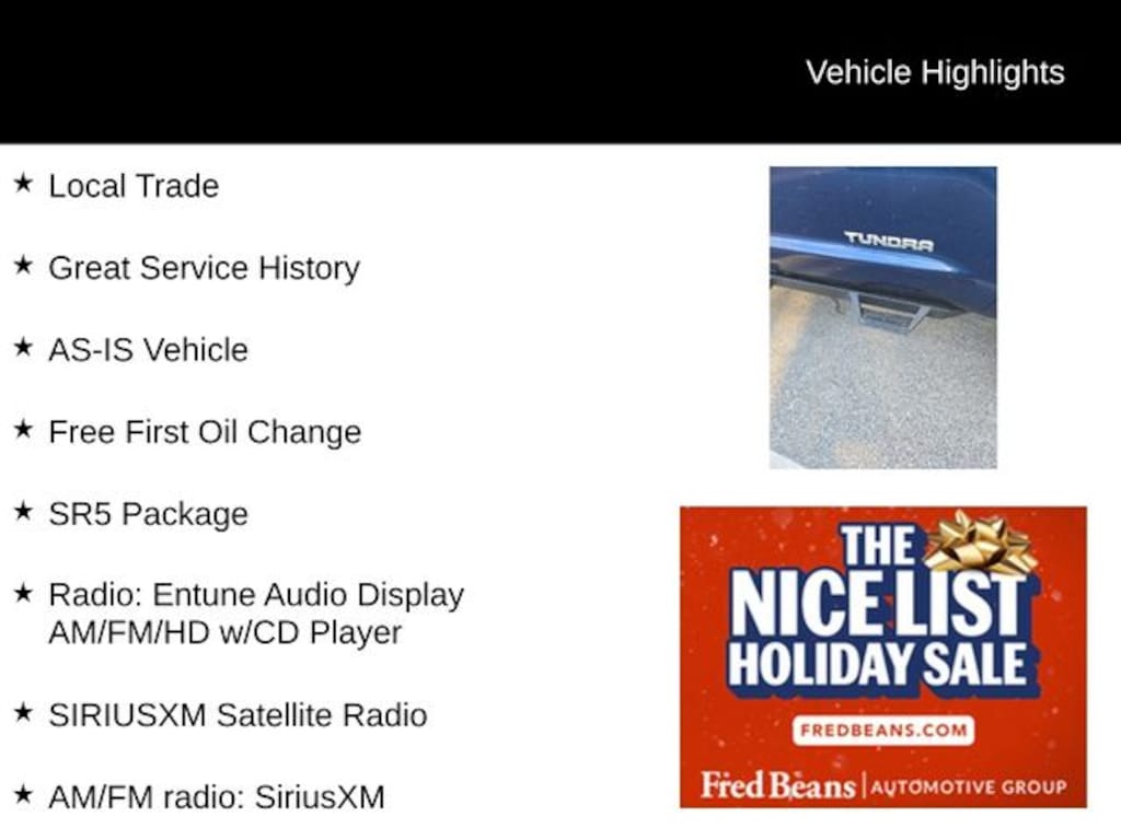 This Tundra is more than just a capable workhorse â?" it's packed with a wealth of premium features that elevate the driving experience. Enjoy the convenience of keyless entry, the clarity of SiriusXM satellite radio, and the added safety of advanced technologies like electronic stability control and a rear-view camera.