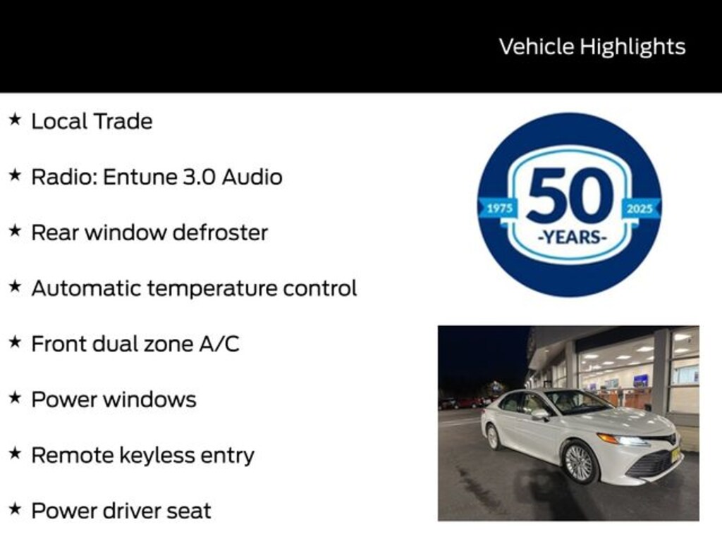 Recent Arrival! 2018 Toyota Camry XLE 2.5L I4 DOHC 16V 8-Speed Automatic FWD 4D Sedan Wind Chill Pearl Local Trade, ABS brakes, Active Cruise Control, Alloy wheels, Automatic temperature control, Compass, Electronic Stability Control, Exterior Parking Camera Rear, Front Bucket Seats, Front dual zone A/C, Heated door mirrors, Heated front seats, Illuminated entry, Low tire pressure warning, Power door mirrors, Power driver seat, Power passenger seat, Power windows, Quilted Perforated Leather Seat Trim, Radio: Entune 3.0 Audio, Rear window defroster, Remote keyless entry, Tilt steering wheel, Traction control, Turn signal indicator mirrors. 29/41 City/Highway MPG