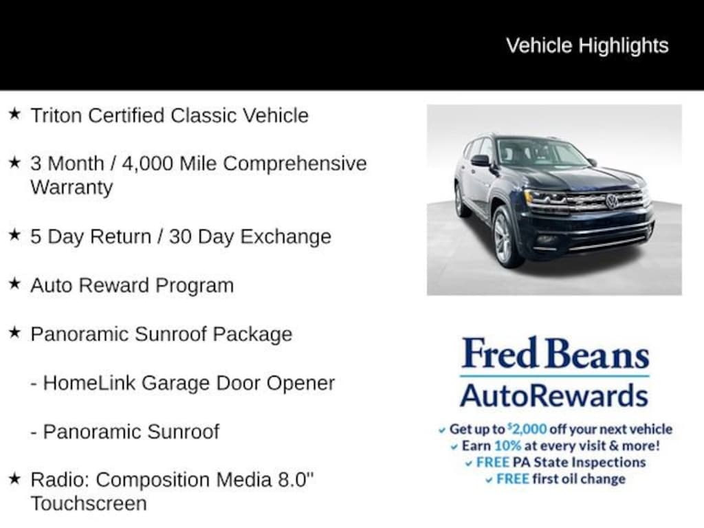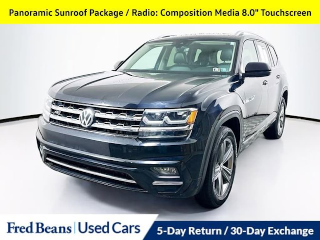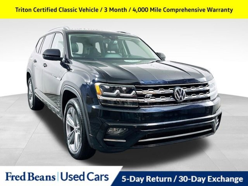 Discover the perfect blend of style, capability, and convenience with this 2019 Volkswagen Atlas 3.6L V6 SE R-Line. This exceptional SUV is ready to elevate your driving experience and accommodate your every need.- 3 Month / 4,000 Mile Comprehensive Warranty- 5 Day Return / 30 Day Exchange- Auto Reward Program- Triton Certified Classic Vehicle- RUBBER MATS KIT - CAPTAIN'S CHAIRS- COMBINATION ASSISTANCE KIT- 2ND-ROW DUAL CAPTAIN'S CHAIRS- TOWING PACKAGE- PANORAMIC SUNROOF PACKAGEBoasting a powerful 3.6L VR6 engine paired with an 8-Speed Automatic transmission and All-Wheel Drive, this Atlas delivers an impressive performance, with 17 MPG in the city and 23 MPG on the highway. The sleek Black exterior and premium features, including the Panoramic Sunroof, HomeLink Garage Door Opener, and Composition Media 8.0 Touchscreen, elevate the driving experience.This Atlas is more than just a capable and well-equipped SUV it's a certified pre-owned vehicle, ensuring you can drive with confidence. The Triton Certified Classic Vehicle designation means this Atlas has undergone a rigorous multi-point inspection and comes with a comprehensive warranty, giving you peace of mind on the road.Imagine the possibilities with this 2019 Volkswagen Atlas 3.6L V6 SE R-Line. With its spacious interior, advanced technology, and exceptional performance, this SUV is ready to take on your adventures with style and capability. Experience the difference for yourself schedule a test drive today and discover why the Atlas should be your next vehicle.